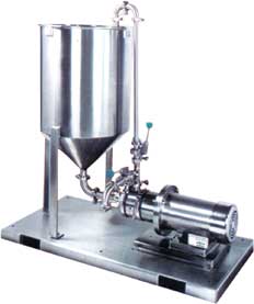 | SM300型設備與存貯罐相連,這種設計保證了所有進入混合容器的物料在出料前都必需經過精密配合的定子和轉子的高速混合剪切。 |